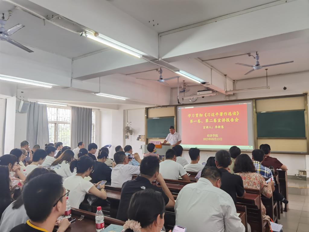9月13日下午,jbo竞博官网登录在广学楼709召开学习贯彻《习近平著作选读》第一卷、第二卷宣讲报告会。学校理论宣讲团成员、马克思主义学院副教授李新慧受邀做了题为《坚定拥护“两个确立” 坚决做到“两个维护”——认真学习<习近平著作选读>第一卷、第二卷》的专题辅导报告。学院领导、教职员工、本科生、研究生党员共128人参加了会议。报告会由学院党委书记陈创主持。