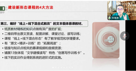 首先,岭南师范学院线上线下混合式国家级一流课程获得者刘海涛教授分享了自己《文学创意写作》国家级一流课程建设与申报的经验体会:一是从写作课程改革建设的基本出发点,指出了写作课教学面临的三大痛点,以及课程改革和教材编写经历的三大转型。二是提出了新时代新技术背景下的教改转型路径、建设新形态课程与教材的四大方法、新时代创意写作教师的修炼路径。三是课程成果以“慕课、音频课、专栏、论文、教材”全媒体出版。随后,刘海涛针对如何调动学生学习积极性、教材编写与一流课程教材选择等内容与学院老师进行了热情的互动交流。
