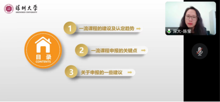 然后,深圳大学jbo竞博官网登录金融系副主任、副教授陈莹博士介绍了自己《金融学》国家级一流课程建设与申报的经验体会,解读了教育部一流课程建设相关文件精神,分析了一流课程五种类型的不同特点、不同评审标准,尤其是一流课程建设的基本原则,国家级一流课程建设、认定趋势、申报的关键点、否决条件等建设和申报技巧。随后,陈莹围绕申报一流课程的基本要求与难点给老师们提出了一些具体建议,并就一流课程申报对申报人与主讲人的相关要求、如何体现课程思政元素和凝练课程特色和亮点、如何克服在一流课程建设过程中学生的负面情绪、如何录制视频课以及如何兼顾师生互动环节和有限课时之间矛盾等老师所提问题给老师们进行了耐心而细致的解答。