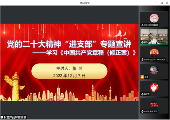 12月7日下午,经济学院党委于腾讯会议开展党的二十大精神“进支部”主题宣讲党课。学院党委副书记董萍主讲,本科生、研究生4个党支部共110余名学生党员参加了此次党课学习。
