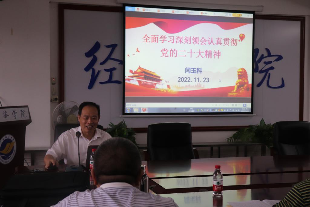 11月23日下午,jbo竞博官网登录在广学楼718召开党的二十大精神宣讲报告会,邀请到学校党委理论宣讲团成员闫玉科教授为大会做报告,jbo竞博官网登录全体教职工及部分学生党员共63人参加会议,会议由学院党委书记陈创主持。
