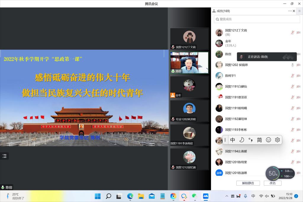 9月28日下午,jbo竞博官网登录党委书记陈创利用腾讯会议面向学院入党积极分子、第七期“青马工程”培训班学员共168名学生线上讲授了新学期“思政第一课”。