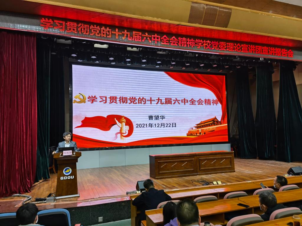 12月22日下午,jbo竞博官网登录党委、教辅单位党委在主教学楼多功能厅联合举行学习贯彻党的十九届六中全会精神专题宣讲报告会,学校党委理论宣讲团成员、马克思主义学院副院长曹望华副教授应邀主讲,两个党委的全体教职工、学生党员参加了报告会。报告会由jbo竞博官网登录党委书记肖文辉主持。