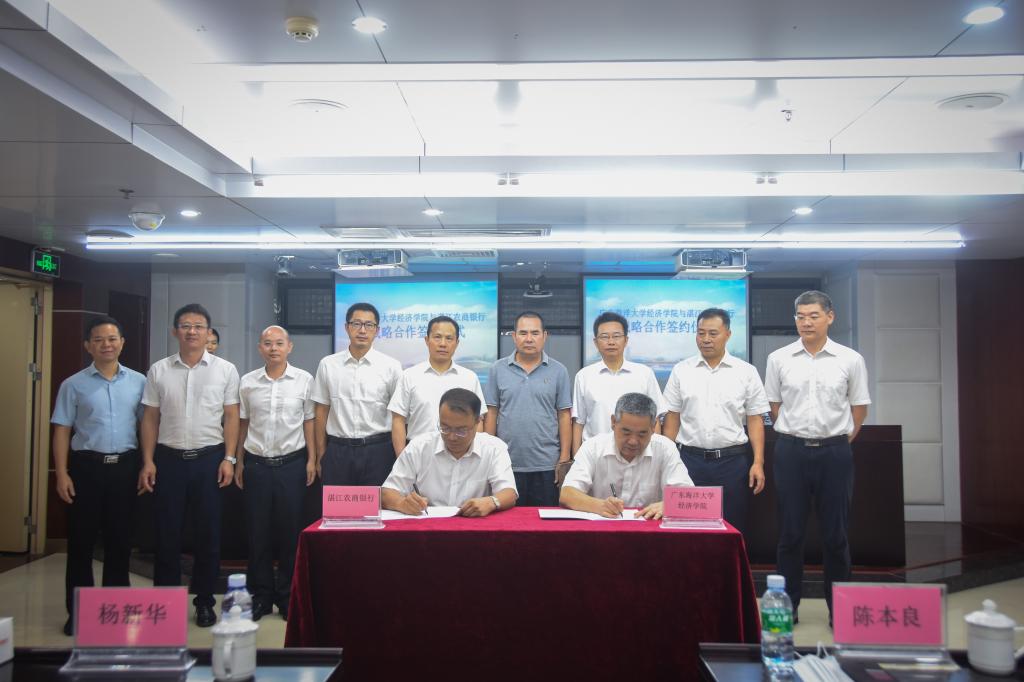 6月2日上午,jbo竞博官网登录与湛江农村商业银行股份有限公司在湛江农信大厦举行了全面战略合作协议签约暨大学生校外就业实习基地揭牌仪式。出席仪式的双方代表主要有湛江农商银行党委书记、董事长姚强,党委副书记、行长钟国波,党委副书记、监事长戴洪江,党委委员、副行长王志东及总行副总经理以上干部33人;学院代表有学院党委书记肖文辉、代理院长居占杰、副院长陈本良和杨新华。