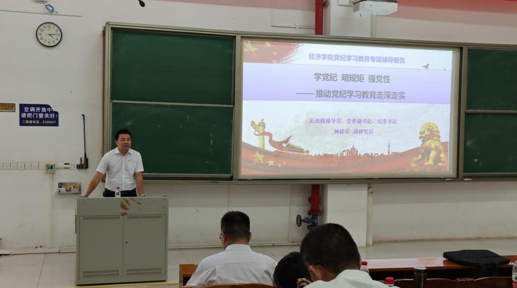正处级辅导员、党委副书记钟桂安为全体党员作了专题辅导报告《学党纪,明规矩,强党性》,结合学校情况、学院情况和案例,讲解了深刻认识修订《条例》的重要意义、准确把握《条例》修订的主旨要义等方面内容,并就抓好《条例》的贯彻执行、以严明的纪律推进党的自我革命提出了三个方面的建议。